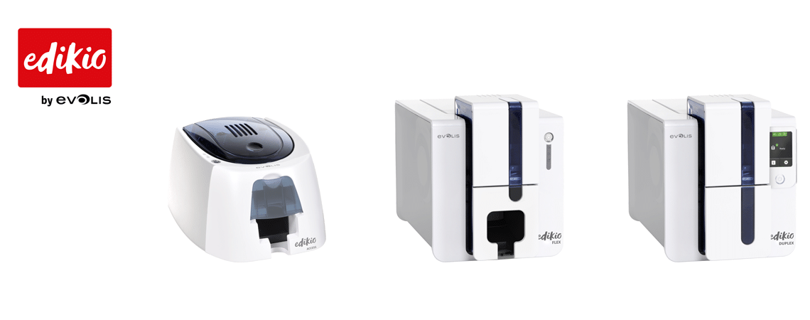 Les imprimantes fonctionnent aussi simplement qu’une imprimante bureautique standard. Les cartes plastiques et le ruban d’impression inclus dans le pack Edikio s’installent en un seul geste.